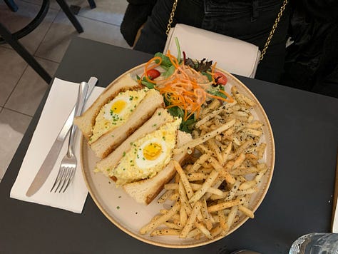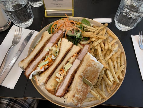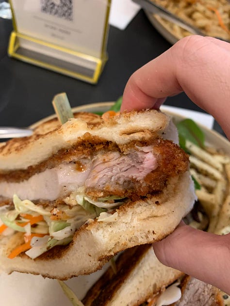 Went to a brunch place with friends, Ohiru Cafe, which served some decent sized portions of pork and egg sandos. The pork katsu sando have cole slaw in the sandwich and came with a good amount of salted, seaweed seasonned fries and salad. By the end, we all wanted more sauce or cole slaw to balance the dryness and saltiness (probably how they get you to buy a drink), but I was happy with the portion size for the price ($15). Lots of other options here for drinks and brunch food. Man, I really want another sando.